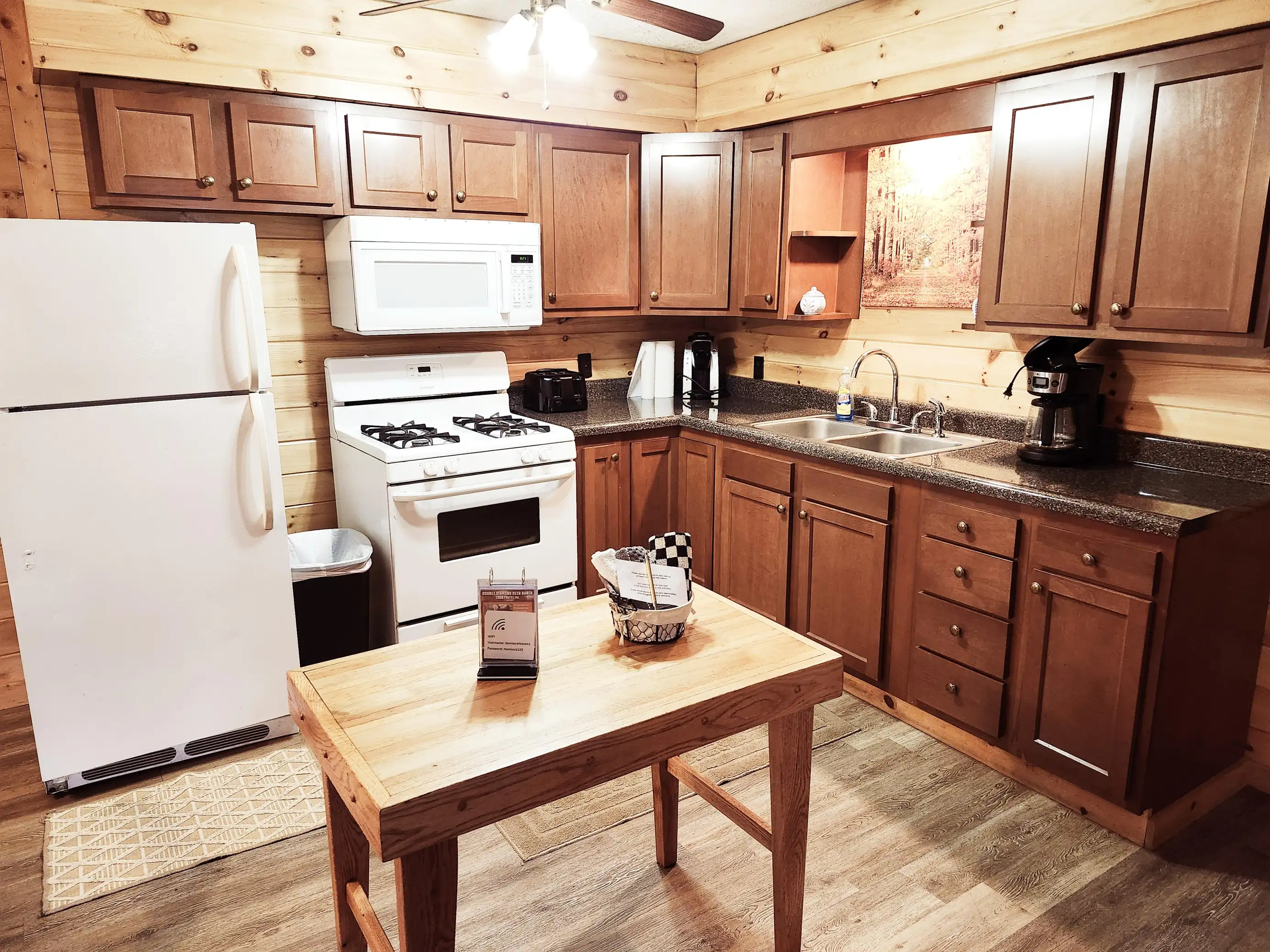Hemlock Haven features a large brick gas log fireplace and an auxiliary gas furnace for your winter enjoyment. Recently added, whole-house air conditioning completes this cabin. The large country kitchen is fully equipped with a microwave, stove, refrigerator, toaster, coffee pot, dishes, cookware, and silverware.